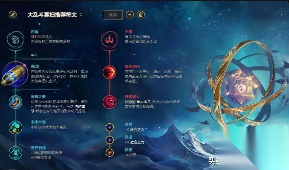 主系符文:先攻+神奇之鞋+未来市场+星界洞悉副系符文:猛然冲击+终极猎人符文解析:寡妇被动自带伪装效果,只要你会走位躲技能,就能保证进场输出时100%触发先攻增伤以及获得后续金币。神奇之鞋省300块,还有额外十点移速。未来市场解决回家出不了装备的尴尬情况。星界洞悉介绍的召唤师技能和装备CD非常有用。猛然冲击提升寡妇爆发伤害。终极猎人减少大招CD,毕竟大招是寡妇唯一保命手段以及保证秒掉核心人物的关键技能。 【出装和加点】