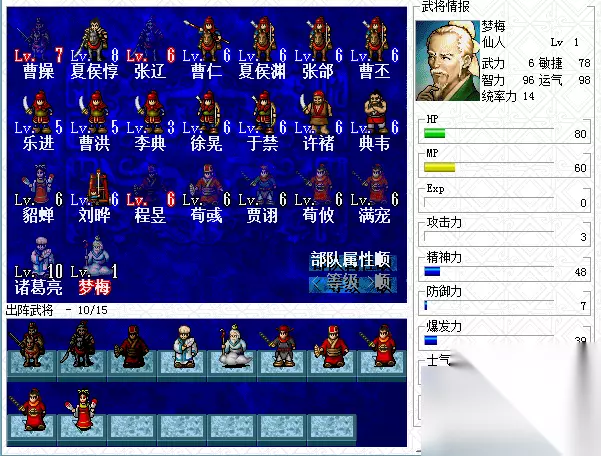 说之前先说两个我方没有的文官,这也是之前说过很多次的,第一是梦梅,本身是个剧情人物,却可以通过扳手改出来,会所有的策略。第二个是诸葛亮,会绝大多数策略。 游戏中没有策略的部队分别是骑兵、弓兵、步兵和炮车,其余的或多或少都有一些。