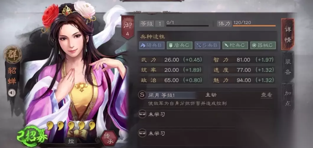 貂蝉在游戏中主要扮演控制型辅助的角色,她的核心价值在于自带战法闭月能有效扰乱敌方节奏。这个战法不仅能强制让敌人分担伤害,还能根据不同目标施加混乱、计穷或虚弱禁疗等负面状态,让对手的输出大打折扣。作为四大美女之一的她,虽然兵种适应性不算突出,但在智力、统率和速度成长方面表现不错,特别适合放在需要打持久战的阵容里。