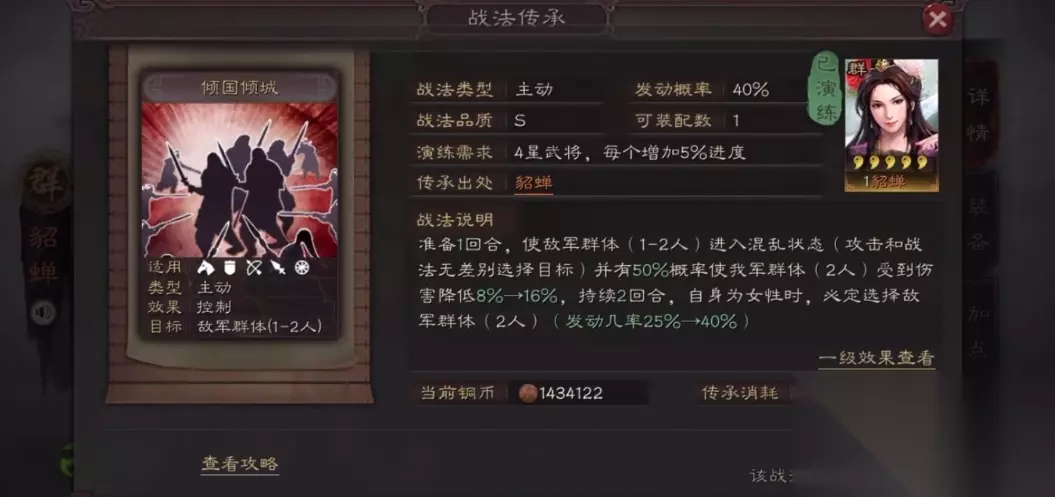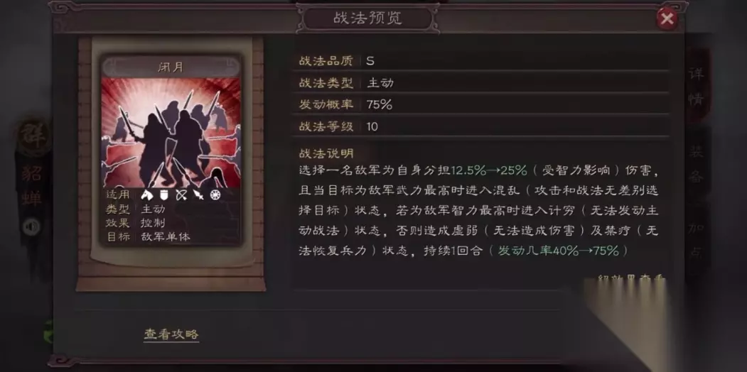 她的闭月战法发动概率相当可观,满级能达到60%,而且效果非常灵活。遇到武力高的敌人就让他自相残杀,碰上智力高的直接封技能,其他情况还能让对手打不出伤害又没法回血。这种多功能的控制能力让她在各种场合都能发挥作用,特别是面对依赖主动技能的队伍时简直就是克星。虽然她本身不算特别肉,但通过合理搭配还是能站得住场的。