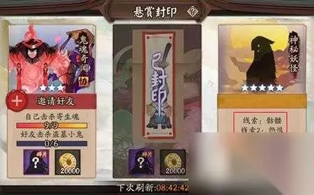 悬赏封印神秘妖怪玩法: 在阴阳师新出的悬赏封印任务中,玩家可能会随机刷到神秘妖怪榜单。玩家只能根据系统提供的线索和事件描述来判断要击杀的怪物。人物完成后将会获得R、SR或者SSR碎片的奖励。在阴阳师新出的悬赏封印任务中,玩家可能会随机刷到神秘妖怪榜单。玩家只能根据系统提供的线索和事件描述来判断要击杀的怪物。人物完成后将会获得R、SR或者SSR碎片的奖励。 线索1:骷髅/剑 线索2:怨恨 任务妖怪:骨女 击杀地点:骷髅剑怨恨的线索就是指骨女了,骨女在妖气封印、御魂副本的5层。