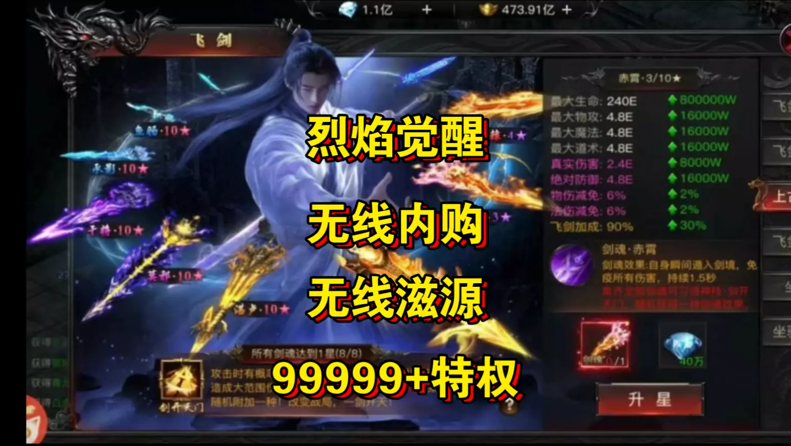 这是一篇分享手游《烈焰觉醒》的帖子,该游戏拥有无限资源特权、无限代金福利,展示了游戏内法神榜排行、满级的武神虎符、摇钱树等强力宝物,呼吁一键三连免费分享该游戏。