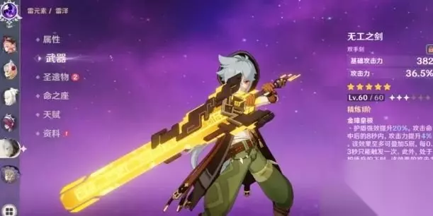 无工之剑 全攻击力词条,武器特性需要在护盾的保护下才可获得双倍增幅,并且还有一定的护盾强效。不过目前来看,护盾强效这个属性继承而来的护盾吃不到。适用角色:优菈、迪卢克、雷泽、辛焱。记住,做不到稳定护盾保护的情况下,这个武器不太行。 小编点评: 现在有了这个攻略我们已经知道了如何去使用这个武器,以及武器所具备的特点属性,玩家可以参考着攻略去完成任务,不再为了完成任务而不知所措。