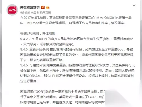 近日LPL重赛风波再起,那么这次是为什么呢?那么一起跟着233乐园小编来看看吧。 LPL季后赛第二轮今日打响,首局比赛由OMG对阵IM,双方交手的第一场比赛,OMG再一次延续了他们赛季后半程的火热状态,在World6盲僧的带领下打的IM抱头鼠窜。 但,OMG初期的节奏并不能彻底决定比赛的走向,而IM更是一支擅长后期翻盘的队伍,本以为IM会为我们再度献上一场翻盘好戏,可“意外”就在此时发生了,IM辅助Road因鼠标故障请求暂停。 经过深思熟虑,官方确定Road选手鼠标故障属实,并且根据联赛规则,宣布进行重赛。