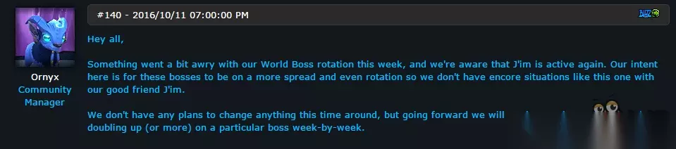 嗨大家好, 我们本周的世界BOSS轮循出现了一些小问题,所以凋零者吉姆又一次激活了。对于这些世界BOSS我们希望能够有一个更为广泛同时又比较平均的循环机制,因此对于这种再次刷新的情况我们并没有在之前考虑在内。 这一次我们不会对本次意外情况进行修正,但今后我们会做出调整以确保特定的BOSS不会每周重复出现。 玩家提问: 所以这就是为什么MMO-Champion宣布本周的世界BOSS依然是吉姆? 魔兽世界社区经理Ornyx: 不知道你指的是什么,但这并不是我们有意为之。 玩家提问: 我已经干掉吉姆了,老实说你们继续修复这个问题才是。 魔兽世界社区经理Ornyx: 我也觉得啊。 玩家提问: 楼上的是说你们的游戏程序员太辣鸡了。 魔兽世界社区经理Ornyx: 我是说,MMO-Champion的帖子是在我们更新后才发布的,新的世界BOSS已经刷新了。如果想要知道原因的话请参考我上面发布的内容。 玩家提问: 天哪,你要知道有些玩家从同一个BOSS身上拿到了更多的装备! 魔兽世界社区经理Ornyx: 这完全是两码事,人家PR好而已。 玩家提问: 请问“有一个更为广泛同时又比较平均的循环机制”是什么意思? 魔兽世界社区经理Ornyx: 我应该描述得比较准确了吧,吉姆下周就不会再重复刷新了。 看了上文这篇《魔兽世界》暴雪蓝帖:关于世界BOSS重复刷新的说明,大家是否都了解了相关信息!找更多好玩热门的手机游戏就来233乐园! 如转载涉及版权等问题,请作者与我司联系,我司将在第一时间删除或支付稿酬。