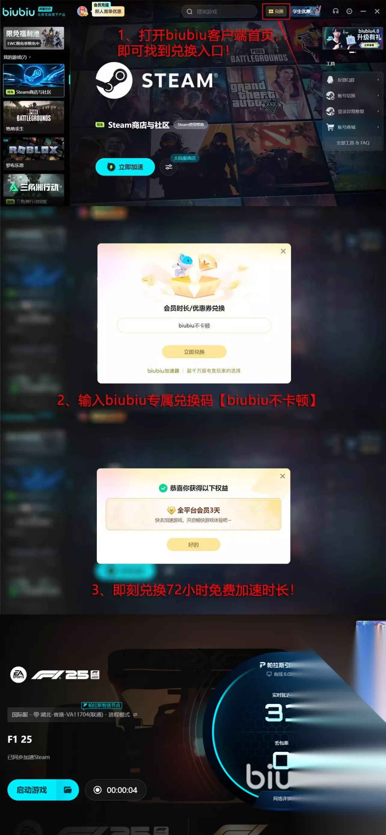 建议大家在玩的时候可以用上方分享的这款加速应用,由于赛车游戏最重要的就是速度,所以在游玩的过程中如果出现网络卡顿延迟等各种问题会影响到大家的操作以及名次,因此需要用到加速器,而小编推荐的这一款给各位新用户带来了不少福利,比如新人注册有24小时免费提速服务,此外,为了防止大家体验时间不够长,平台还给全体用户都提供了三天的额外加速时长,小伙伴们自己用【biubiu不卡顿】在指定兑换区域领取即可。