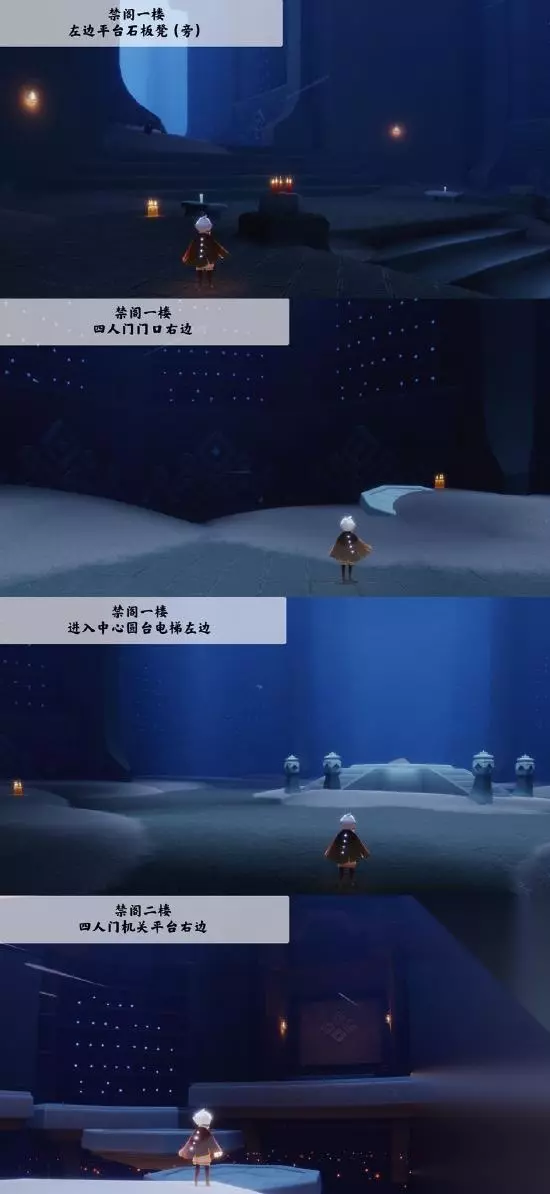季节蜡烛 禁阁一楼☞左边平台石板登(旁) 禁阁一楼☞四人门门口右边 禁阁一楼☞进入中心圆台电梯左边 禁阁一楼☞四人门机关平台右边