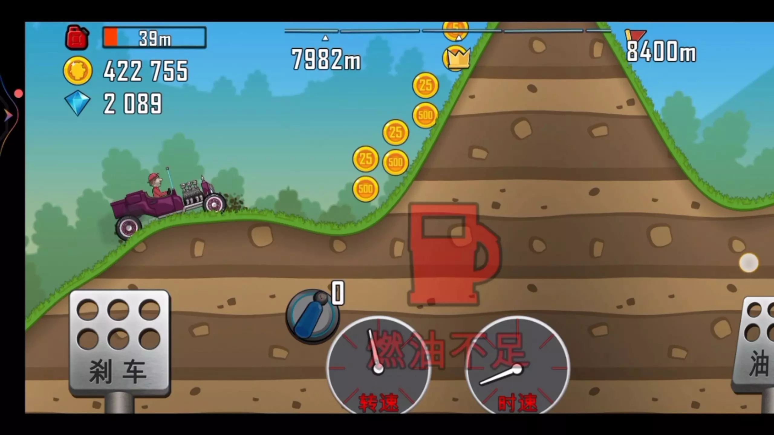 这是手游《登山赛车》的游戏情报帖,展示了在训练营关卡驾驶大手指车辆的游戏过程,行驶距离突破至23954m,但未达成30585m的目标,过程中可收集金币、钻石,完成关卡挑战。