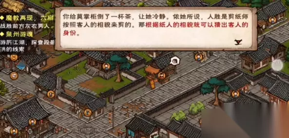2、每种纸人都会有各自的描述我们可以看一下。 3、我们根据纸人的描述推断出小纸人一:头戴白花-烟波楼 水仙、小纸人二:头戴蓝色玉坠-活动大使旁的江湖地质录作者 徐行芝、小纸人三:头戴珠花-洛阳镖局万夫人。