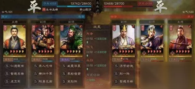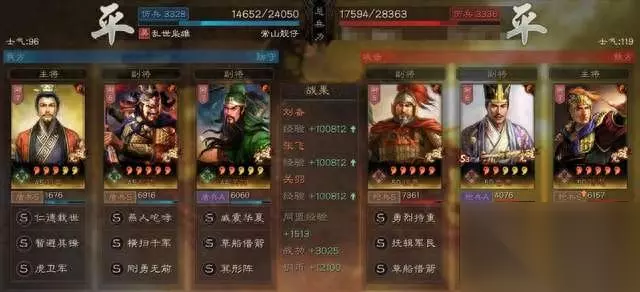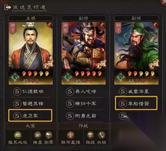 阵容搭配 刘备:暂避其锋、虎卫军,兵书:援其必攻、掩虚/励军 张飞:横扫千军、刚勇无前,兵书:胜而益强、胜战/执锐 关羽:草船借箭、箕形阵,兵书:后发先至、妙算、占卜 加点:刘备智统对点、张飞全武,关羽全统 搭配思路 大部分战法还是PK赛季桃园的常规战法:箕形阵、暂避其锋、刚勇无前。改动的地方在陷阵营改了虎卫军加草船借箭组合,既有了伤害、又有了“急救”的治疗。还多了解控。