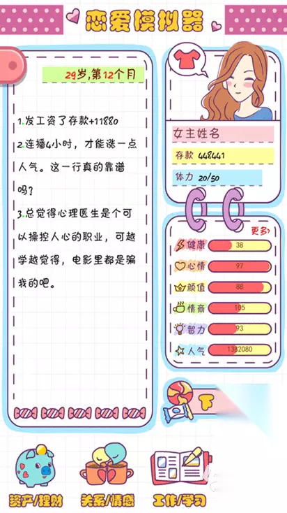 游戏名:《开局五个亿》 《开局五个亿》是一款超现实模拟经营类互动影像游戏,你将作为主角,完成启动资金五个亿的创业历程。甜蜜的烦恼悄然而至,六位身份、类型各异的美女逐一闯入了你的事业和生活。你将如何应对她们的好感并平衡与她们之间感情和事业的关系?注意,“财富值”和“好感值”将共同决定你们的故事结局。