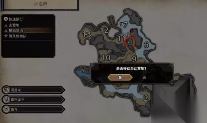 《怪物猎人崛起曙光》纯水晶采集位置 1、首先我们打开地图,移动到水没林的辅助营地,就是11区右下的辅助营地,如图所示的红圈标记位置。