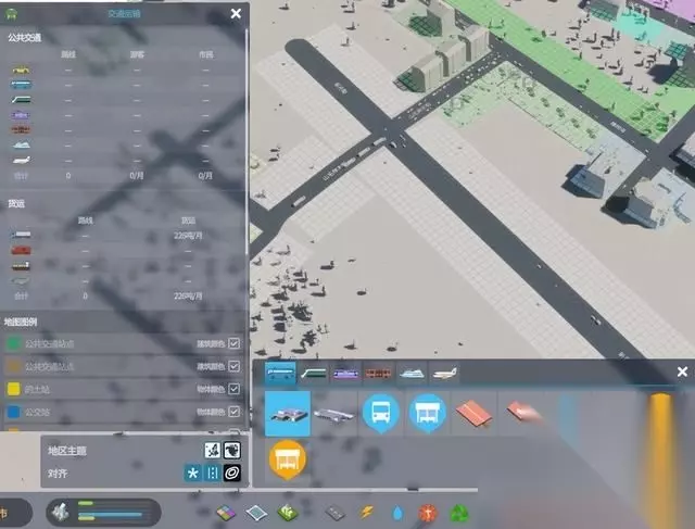 交通运输 各项交通运输工具通过城市升级逐级解锁,设定交通枢纽后即可进行线路的设定。 相对比较特殊的是公交车站,在设定好站台后再通过选择站台以设定路线,相对比较方便。