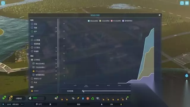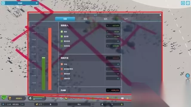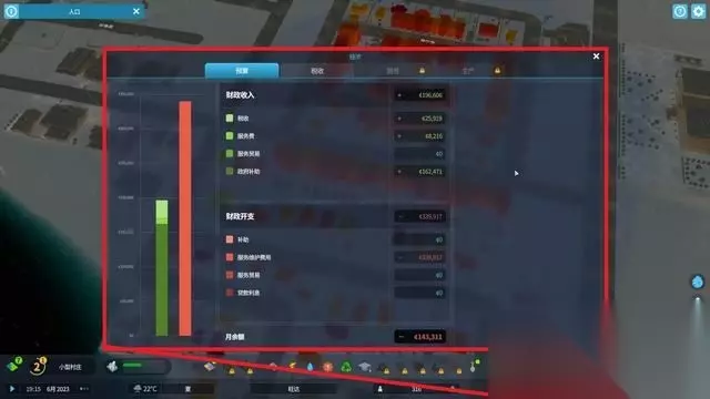 经济界面可以直观地看到当前城市的收支和资源产出。 在满意度过低的时候,可以适当调整税收幅度以临时挽回满意度。