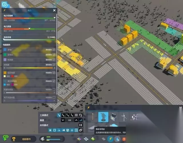 电力系统 电力系统与道路的规划挂钩,默认道路下方都有电线,也可以自行改建。 电力也分有高低压,通常可以将地下线路看为低压,地上线路(电塔)为高压。