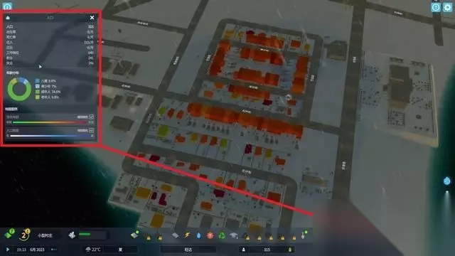 人口界面可以看到当前居住区的居民比例,并通过年龄层的分布数量来判断是否需要增加、或改造某些设施。