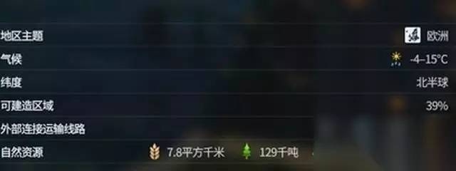 右下角可以看到选择地区的环境、资源水平与运输配置。 自然资源的数量基本决定着中后期的发展。