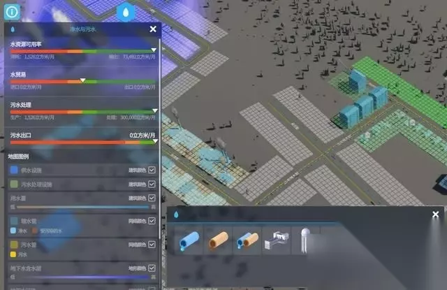 水利系统 前期的排污和水源需要依赖河流来完成,水利系统也和电力相同,与道路规划挂钩。 需要注意的是,河流有流向之分,别犯诸如“上游排污下游喝水”的基本错误就好。