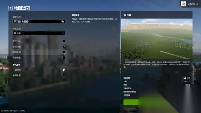 选择地区后,可以对整局游戏进行基本设置。 除“自然灾害”、“解锁全部”和“无限资金”外,基本就是一些简单的美化设置。 【备注】推荐新手先开启教学,并启用“无限资金”来熟悉游戏整体流程。