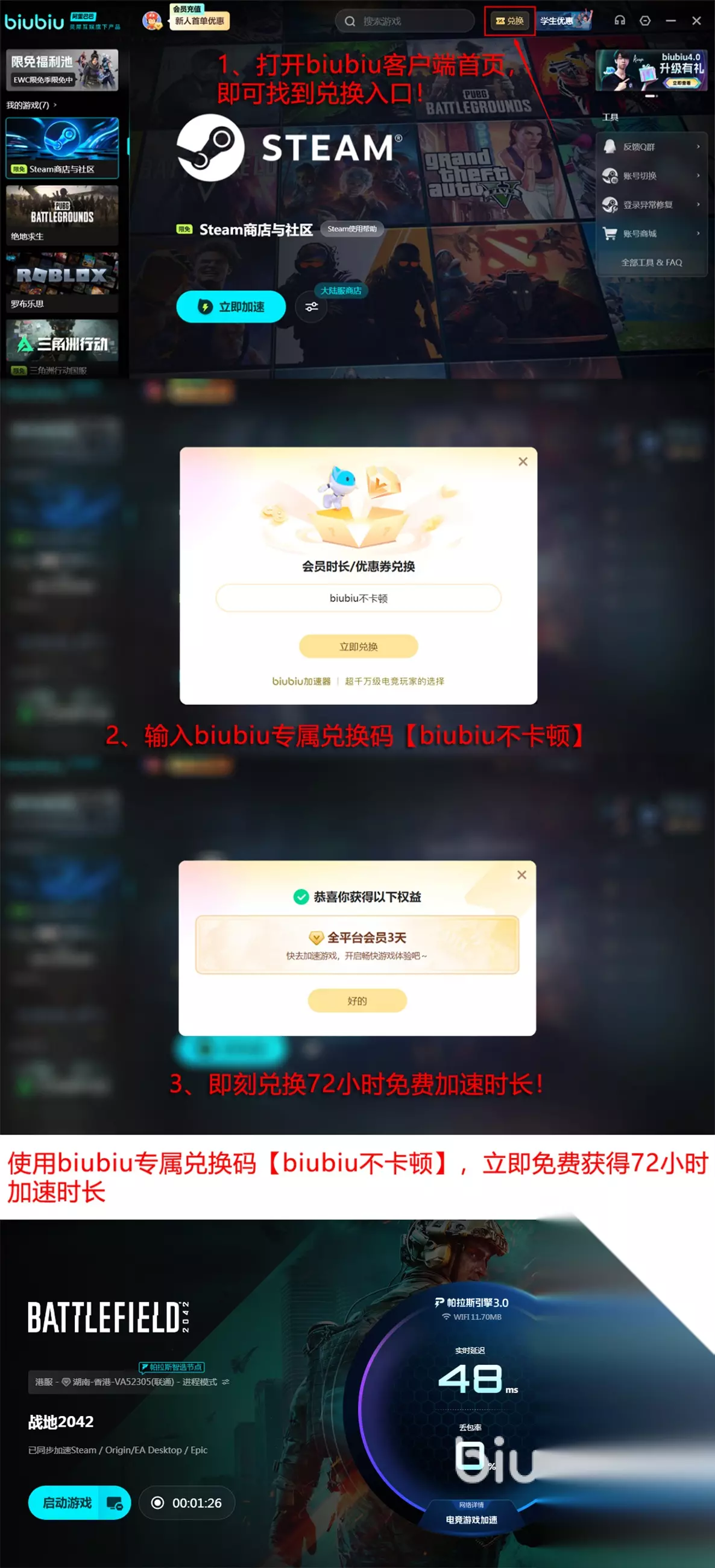 为了能吸引更多人加入进来,biubiu还放出了很多福利,首先是推出了一个每个号都可以用一次的兑换码【biubiu不卡顿】,够兑换72小时加速时长。如果是刚注册的新号,先不要着急用兑换码,新号能先免费加速24小时,这样总计拥有96小时的新人福利,试用时间非常充裕。