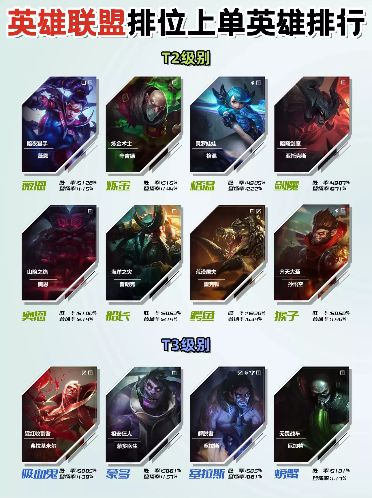 五个人的游戏,对团队价值高的上单才是好上单👍 上单的主要作用是在确保自己发育的情况下进行全图的支援,有时还会利用自己的先手控制技能进行开团! . 所以今天这篇笔记想给大家分享下S14赛季“峡谷排位上单英雄排行”,从T0到T3级全解析,教你用版本答案光速上分! . 🌟T0级:版本爹中爹! 🔺腕豪:一拳超人,没什么好说的,给我砸 🔺提莫:一直是一个让人又爱又恨的英雄,手握致盲神技,又是长手英雄,团战可以输提莫必须死 🔺掘墓:单推带线能力强,上单掘墓之所以是线霸,靠的就是老婆儿子 . 🌟T1级: 🔺狗头:叠Q就完事,血厚攻击还高,打团是屹立不倒的战神 🔺剑姬:英雄机制其实不复杂,难就难在对线处理要很灵活,操作上限高 🔺铁男:关灯单挑,大招领域里1v1很难扛得住,团战专治不服 🔺天使:16级逆天改命,拥有大后期超恐怖的输出 🔺蚂蚱:线霸,虫子推线恶心对手,大招定点控刺客 🔺石头人:作为新手,你只需要出肉就行了,打团只需一个大招就能证明存在的意义 . 🌟T2级: 🔺薇恩:上单AD,脆皮但灵活,滚雪球强,但被抓容易炸穿 🔺炼金:遛狗专业户,断兵线恶心对手,但队友容易4v5心态炸裂 🔺格温:真伤剪刀妹,专切前排 🔺剑魔:打人也是不能无脑上,要拉扯,有强度的同时也非常有趣 🔺奥恩:是比较万金油的上单,对线强度有,控制有,后期还能给队友打装备 🔺船长:桶子炸得好,对面20投,但操作难度拉满 🔺鳄鱼:是个上单常青树了,一直没有掉出过热门上单的选择 🔺猴子:配合电刑瞬间秒杀,削弱多次非版本首选 . 🌟T3级: 🔺吸血鬼🔺蒙多🔺塞拉斯🔺螃蟹 . 无脑T0! 绝活选T1! 逆版本不建议!T2T3容易变突破口! ⚠排行具有时效性(2025.4.15参考于官网资料库) 暂且提供排位胜率和登场率数据,数据每天都会有些变化 仅供参考,不一定适合所有玩家的标准 不知道大家喜欢的英雄和喜欢的理由都是哪些呢? #英雄联盟 #英雄联盟端游 #英雄联盟攻略 #英雄联盟上单 #英雄联盟上单王 #端午游戏推荐 #英雄联盟英雄 #英雄联盟手游入门