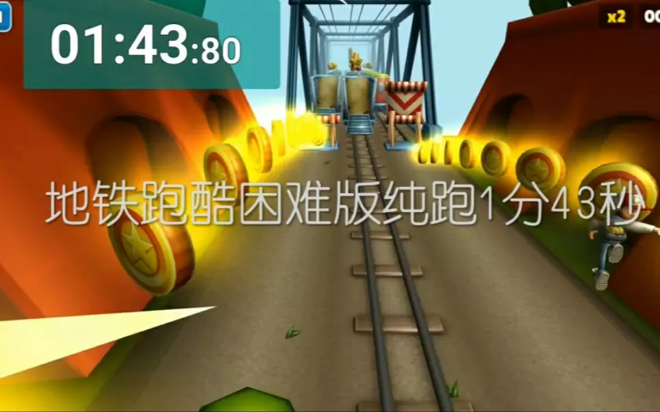 本帖展示了地铁跑酷困难版的纯跑玩法,该版本仅加快了游戏速度,作者经过一小时练习,跑出了1分18秒的成绩,呈现了游戏中的跑酷过程。