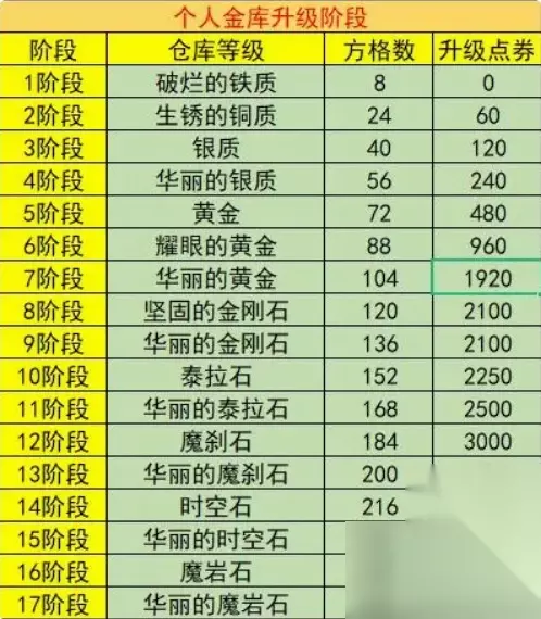账号金库部分等级升级所需: 1、体验仓库:最多可保存1种物品、1000万金币,10万金币开通; 2、一级仓库:最多可保存8种物品、1亿金币,200万金币开通; 3、二级仓库:最多可保存16种物品、1.5亿金币,2000点券开通; 4、三级仓库:最多可保存24种物品、2亿金币,虚空魔石250个开通。