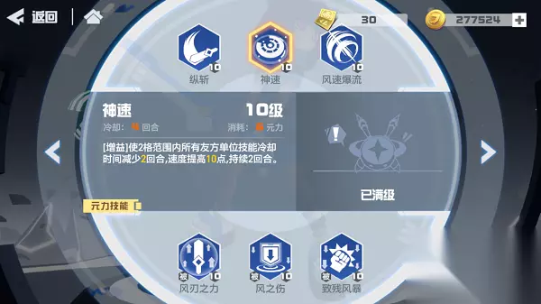 ▶元力技能:神速 使2格范围内所有友方单位技能冷却时间减少2回合,速度提高1(10)点,持续2回合。 冷却:4回合 消耗:6元力