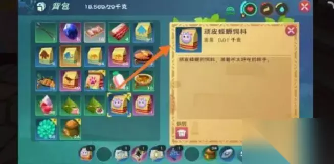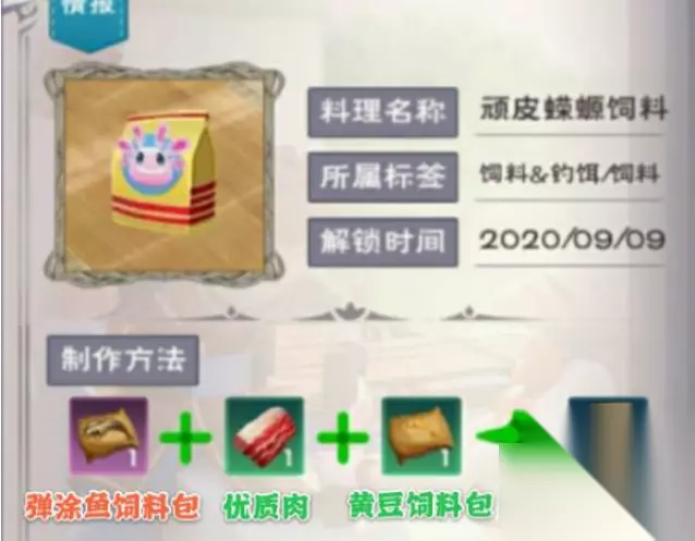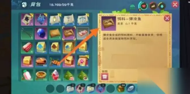 2、进入游戏以后,准备材料:饲料-弹涂鱼、饲料-黄豆、优质饲喂肉块。