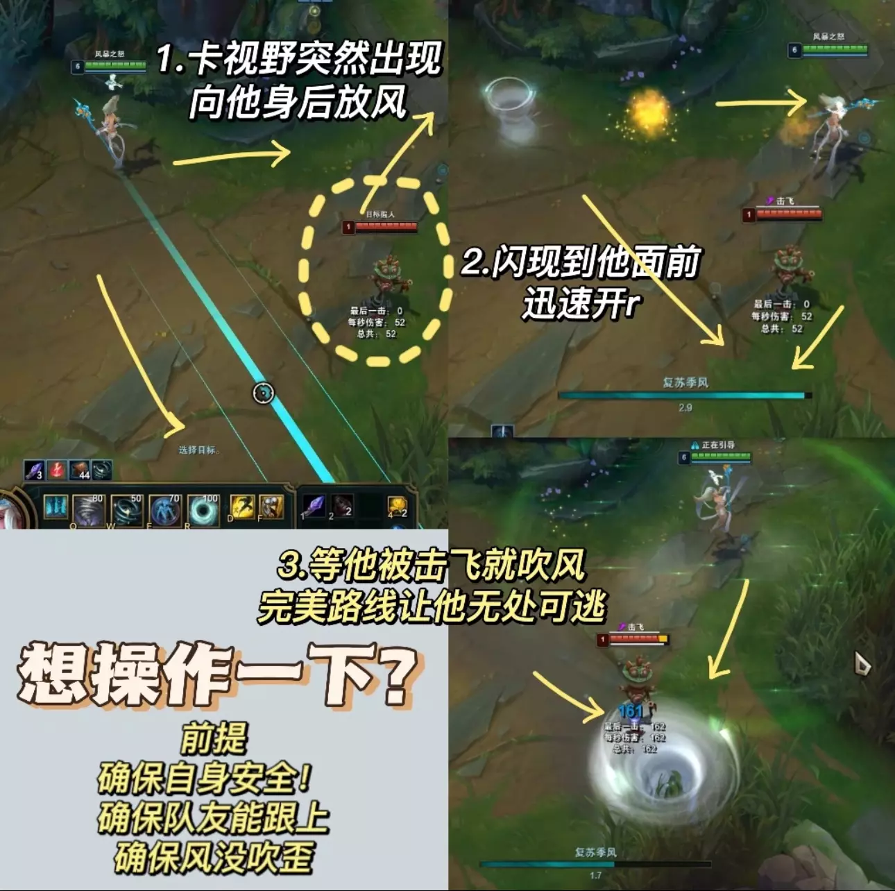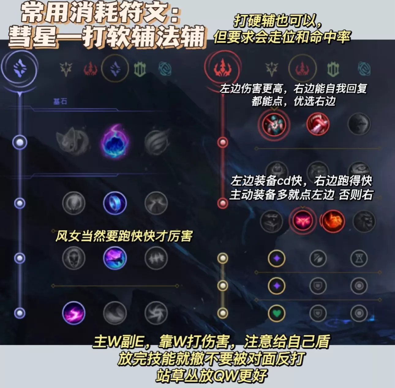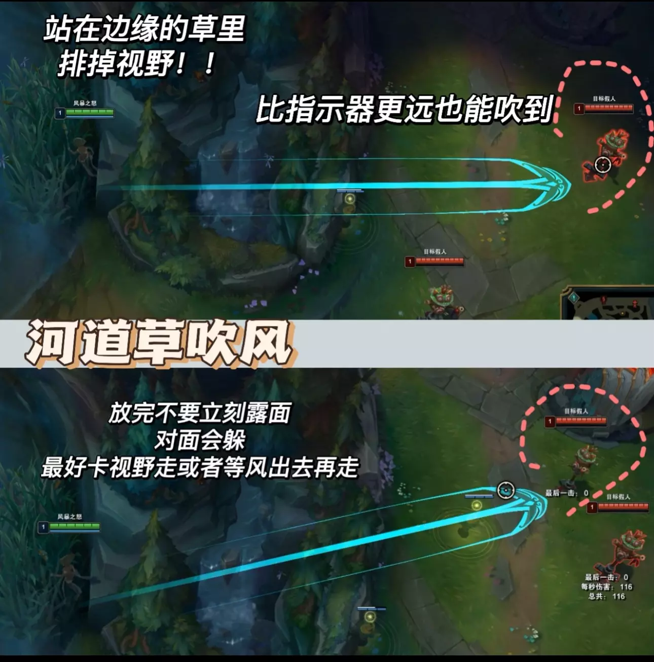 符文装备看上篇! 1⃣️Q技能—Q的预判决定风女的上限,要多练才能熟练!(有配图❗️看图学) 1.最基础:风蓄越久越长,秒Q的风只能吹指示器3/4,所以除非需要打断技能不要太早把Q按出去。 2.一些技巧Q ❤️对线消耗风❗️图3、4:草丛中蓄风,不要露视野,放对角线更容易中,放完风后等一会然后向风的45°斜前走位,逼你想命中的人后退走到你的风上。这个要先试探两次,有的人可能看你上前直接打你,那你就和风走的方向一致;有人根本不走位,那你就直接吹他,要先摸清对面的走位逻辑。 ❤️趁对面ad补刀放风:己方小兵掉到半血就可以准备蓄风,往对面的后排兵横着吹命中率超高,对面补残血兵时直接放一般都会中,躲风就会漏兵 ❤️草丛阴风❗️图5:适用于蓝方风女,站在下路河道边缘草往对面塔下横向放风,前提草里没眼 ❤️声东击西:风吹向补刀的ad,上前w辅助然后吹放松的ad,反之同理 ‼️对线消耗的风前提均势或者有线权能压制,如果对面占优势你上前逼走位很有可能挨打,这种情况风留着打断或者等对面失误更好。 ❤️反手控制风:对线硬辅,面对他放风然后假装后撤,等他上来勾你把风放出去;或者被钩的一瞬间吹他抵消控制;还有对面推线进来的时候横着放一道风封住路口,等他来就吹风。打硬辅可以用w消耗留住q自保,丢了q威胁瞬间下降。 ❤️逃跑风❗️图6:沿着自己逃跑的方向放,这样对面还追你肯定会被风吹起来。救队友同理,往队友逃跑方向放风。 2⃣️W:w可以放到小兵身上,千万不要手滑! 对面有盾就走位上前平a骗盾,比较单纯的辅助把盾交了后你再w消耗。 ⚠️w之后最好跟一个平a多打一点伤害,对面如果手长你放w的同时要给自己挂盾不然很伤! ⚠️放完w之后自己移速会下降,所以逃跑的时候用q去留对面不要轻易交w可能会被对面追上。 3⃣️E:很简单,可以给塔挂盾 4⃣️R: 1.要注意不可阻挡的英雄等他们放完技能你再r(比如人马,石头人,奥拉夫这些),不然吹不开,可先用盾挡伤害。 2.保护ad,对面刺客来切他第一时间r,不要等对面打完伤害,需要反应快点。 3.和前排一起的时慎用r,不要把他的目标都吹走 4.图7❗️熟练度高的抓人或留人可以闪现r把对面吹回来,也可以先放一个q然后通过r把他吹到你的q上,这个需要对技能范围有了解 #lol #英雄联盟 #风女