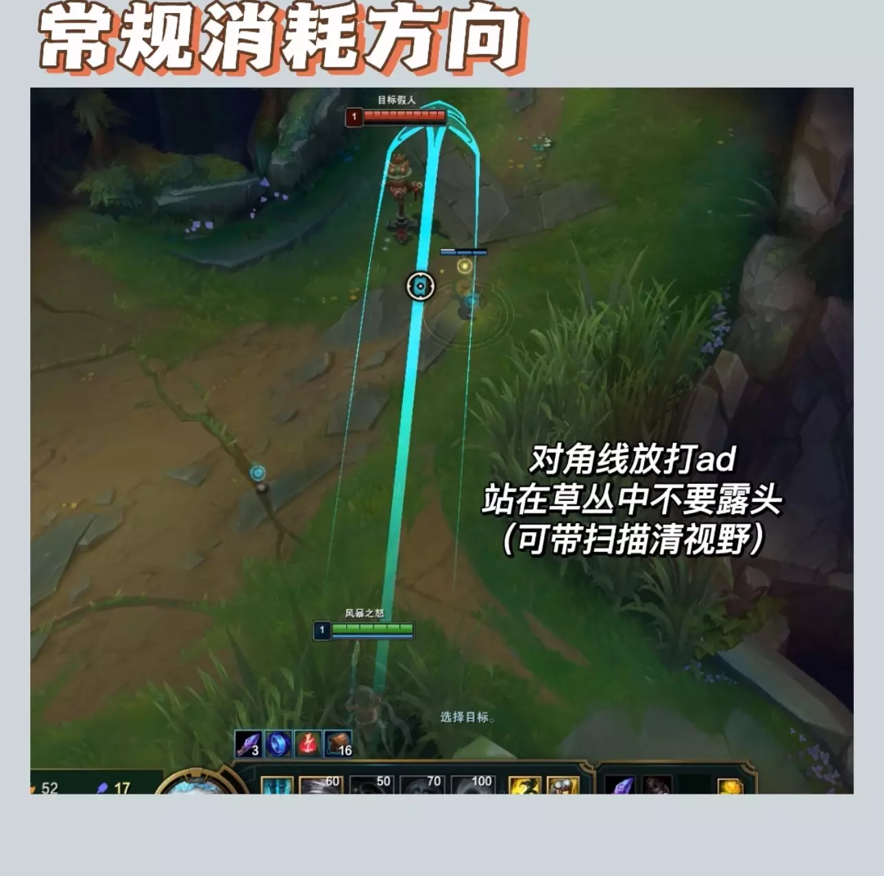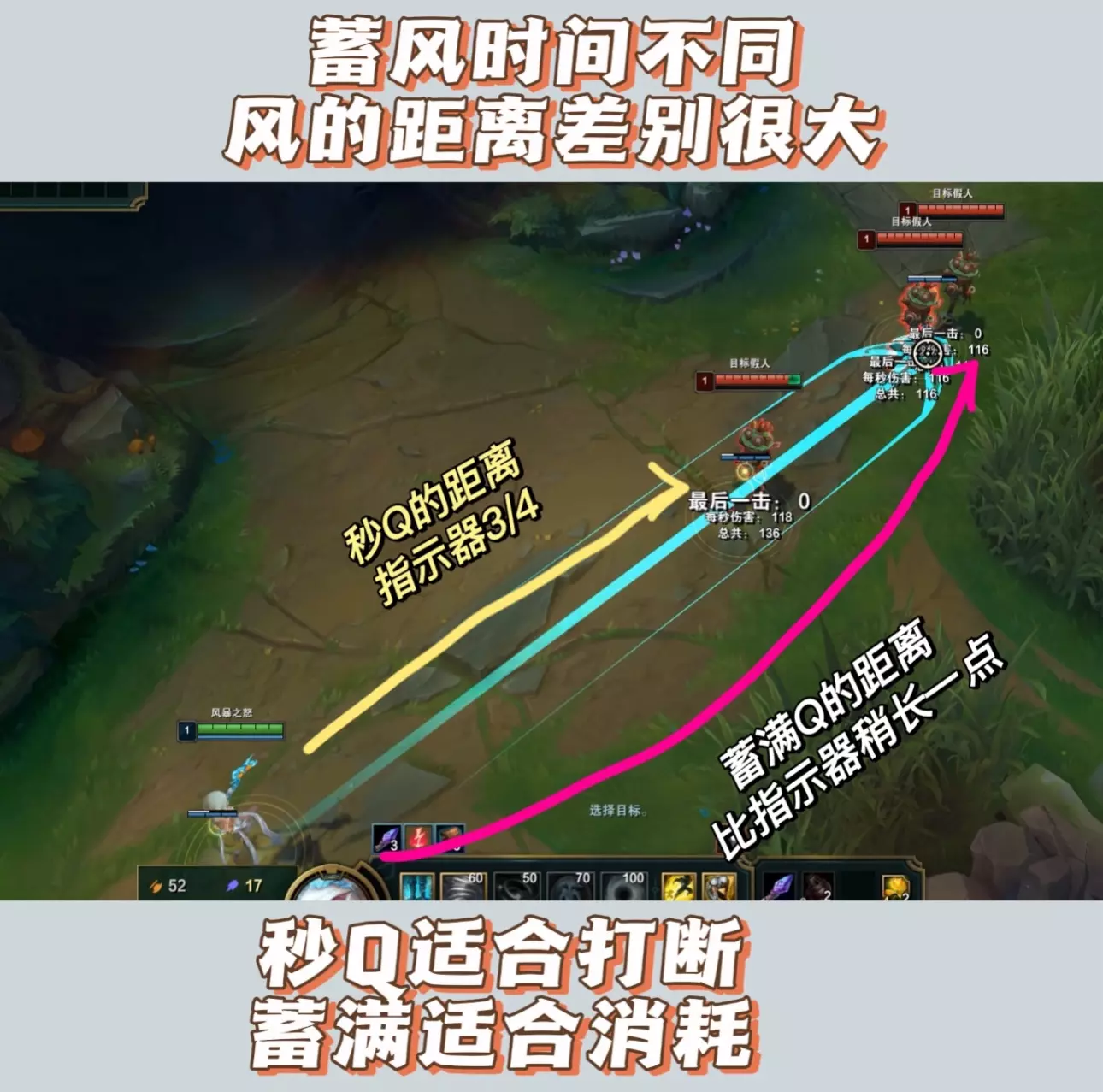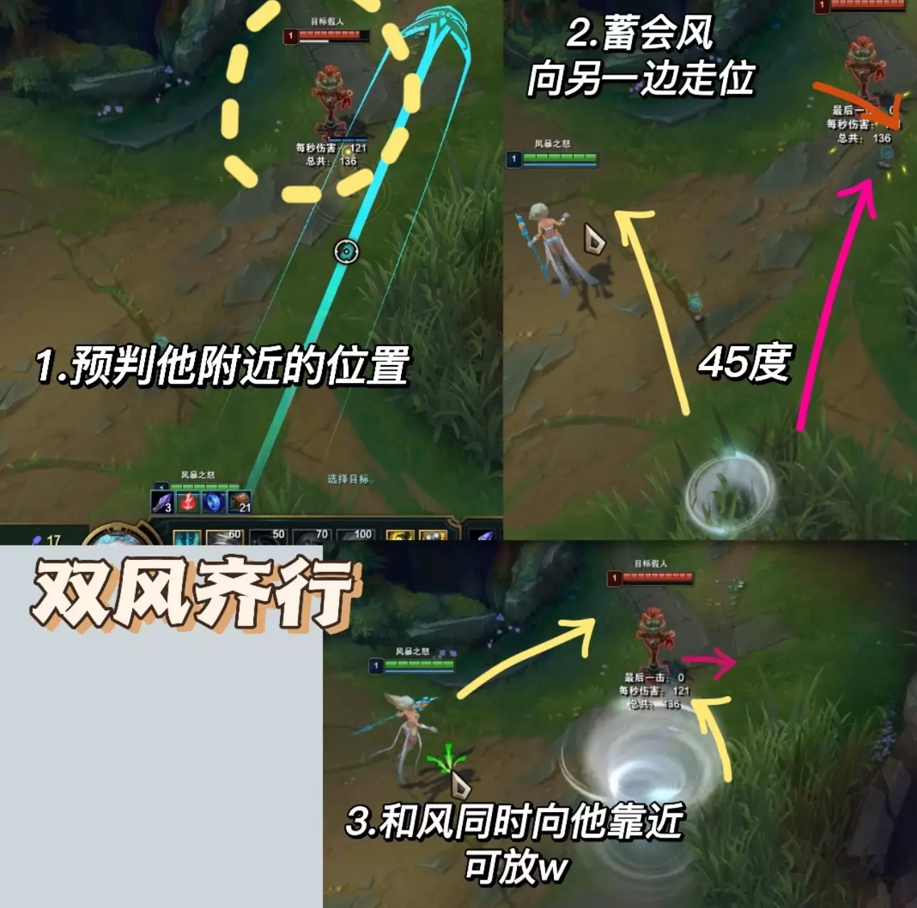 符文装备看上篇! 1⃣️Q技能—Q的预判决定风女的上限,要多练才能熟练!(有配图❗️看图学) 1.最基础:风蓄越久越长,秒Q的风只能吹指示器3/4,所以除非需要打断技能不要太早把Q按出去。 2.一些技巧Q ❤️对线消耗风❗️图3、4:草丛中蓄风,不要露视野,放对角线更容易中,放完风后等一会然后向风的45°斜前走位,逼你想命中的人后退走到你的风上。这个要先试探两次,有的人可能看你上前直接打你,那你就和风走的方向一致;有人根本不走位,那你就直接吹他,要先摸清对面的走位逻辑。 ❤️趁对面ad补刀放风:己方小兵掉到半血就可以准备蓄风,往对面的后排兵横着吹命中率超高,对面补残血兵时直接放一般都会中,躲风就会漏兵 ❤️草丛阴风❗️图5:适用于蓝方风女,站在下路河道边缘草往对面塔下横向放风,前提草里没眼 ❤️声东击西:风吹向补刀的ad,上前w辅助然后吹放松的ad,反之同理 ‼️对线消耗的风前提均势或者有线权能压制,如果对面占优势你上前逼走位很有可能挨打,这种情况风留着打断或者等对面失误更好。 ❤️反手控制风:对线硬辅,面对他放风然后假装后撤,等他上来勾你把风放出去;或者被钩的一瞬间吹他抵消控制;还有对面推线进来的时候横着放一道风封住路口,等他来就吹风。打硬辅可以用w消耗留住q自保,丢了q威胁瞬间下降。 ❤️逃跑风❗️图6:沿着自己逃跑的方向放,这样对面还追你肯定会被风吹起来。救队友同理,往队友逃跑方向放风。 2⃣️W:w可以放到小兵身上,千万不要手滑! 对面有盾就走位上前平a骗盾,比较单纯的辅助把盾交了后你再w消耗。 ⚠️w之后最好跟一个平a多打一点伤害,对面如果手长你放w的同时要给自己挂盾不然很伤! ⚠️放完w之后自己移速会下降,所以逃跑的时候用q去留对面不要轻易交w可能会被对面追上。 3⃣️E:很简单,可以给塔挂盾 4⃣️R: 1.要注意不可阻挡的英雄等他们放完技能你再r(比如人马,石头人,奥拉夫这些),不然吹不开,可先用盾挡伤害。 2.保护ad,对面刺客来切他第一时间r,不要等对面打完伤害,需要反应快点。 3.和前排一起的时慎用r,不要把他的目标都吹走 4.图7❗️熟练度高的抓人或留人可以闪现r把对面吹回来,也可以先放一个q然后通过r把他吹到你的q上,这个需要对技能范围有了解 #lol #英雄联盟 #风女