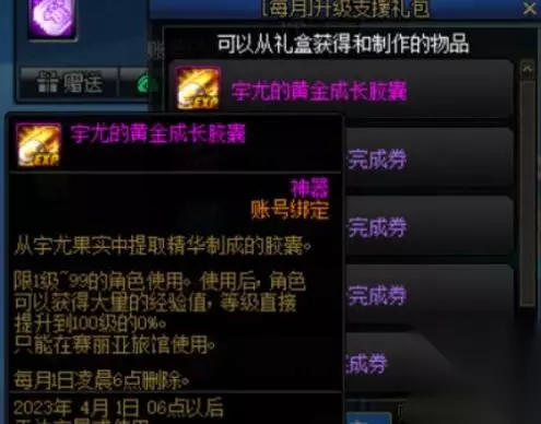 5、宇尤的黄金成长胶囊:这个道具需要我们在商场中购买每月升级礼包,使用后可以直接让100级以下的角色直接到100级。