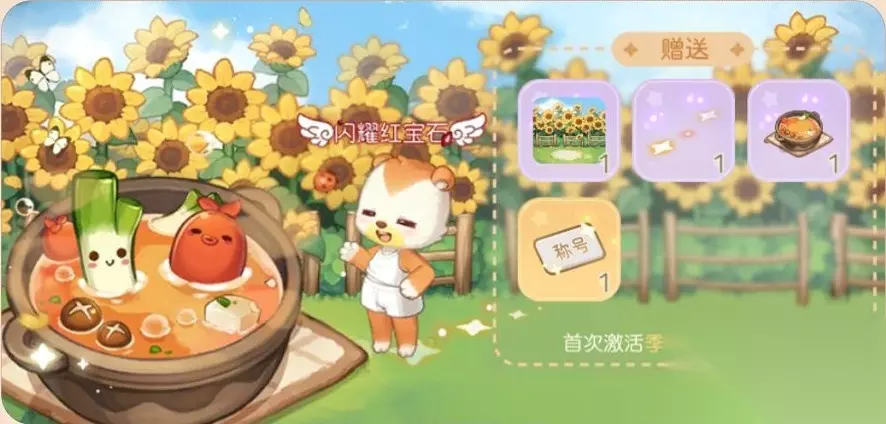 【典藏装饰】向日葵花海背景 【典藏交互家具】火锅浴缸 【典藏足迹】星光点点足迹 【晨星称号】闪耀红宝石 年卡福利: