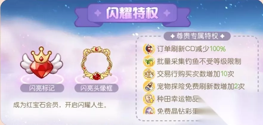 成为红宝石会员,即刻获得闪亮标记和闪亮头像框,还有超多尊贵专属特权; *订单刷新CD减少100% *免费晶钻彩蛋CD减少20% *批量采集钓鱼不受等级限制 *免费金币彩蛋CD减少100% *交易行购买次数增加10次 *种田生产时间缩短20% *宠物探险免费刷新数增加2次 *生产量增加2个 *种田幸运物品概率增加5% 特权礼包: