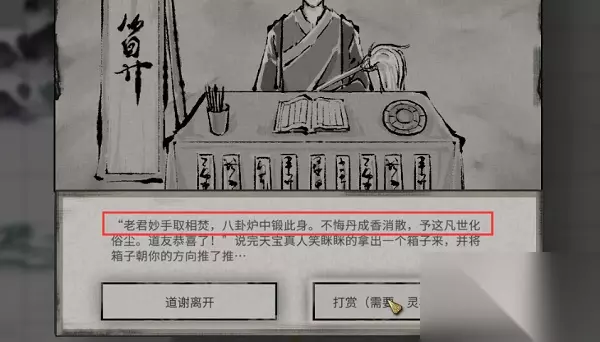 1、丹修赐丹 结果:老君妙手取相焚,八卦炉中锻此身。不悔丹成香消散,予这凡世化俗尘。 一段时间之后会遇到一个炼丹师送我们丹药。