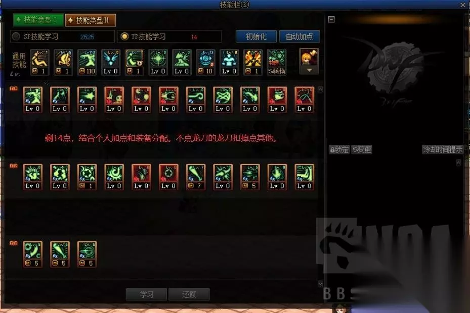 剩下的SP2525点可以用图中的三个无色无色中的任意一个+另一个无色等级来填充,或者用两个小技能来填充。如果觉得球不够,可以选择自动追球点高一些。 个人建议选择漫小啦啦/使徒之舞,多点sp来攻击。以后可能会放弃强压,补强攻sp+tp,带强攻石。目前我个人的石护坦克是龙刀大破霸群,感觉还有很大的优化空间。 放弃龙刀可以获得4685点SP点进行个人分配,但不建议放弃,除非确定个人需要石防护优化其他无色,而且没有地方带龙刀防护石头。