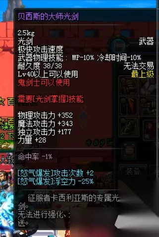 贝西斯的大师光剑也许是有史以来最奇葩的武器属性了!其它光剑都是加剑帝、剑魂、黑武的技能,唯独贝西斯的大师光剑加的却是红眼的技能,最关键的是红眼带不了,剑魂也无法偷学怒气爆发呀,妥妥一“高级蓝装”啊。4.+15超强力史诗道具