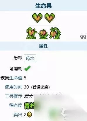 一旦使用它,玩家将会永久增加5点生命值。且使得玩家生命值中的一个红色的心变成金色。 提升到最大的 500 点生命值上限需要 20 个生命果,届时玩家所有的心都会变成金色。 像其他植物一样,生命果可以用任何武器或工具来采集。不是必须得用镐才能采集,任何种类的攻击都可以采集它们。 生命果在金属探测器中有着最高的优先级,在生命值已达上限后。若仍有生命果在探测区域内出现,会盖过其他任何物品,进而增大探测其他矿物或宝物的难度。 以上就是泰拉瑞亚果实的内容,更多精彩内容,请继续关注。