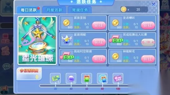 每日任务有奖励,全新活跃系统上线 为了更好的回馈的玩家,《一起来跳舞》(原天天炫舞)在新版本中将推出全新的活跃系统,玩家每天完成每日任务将获得奖励,完成每日活跃任务可获得活跃值,一定的活跃值,可以领取相应的奖励。