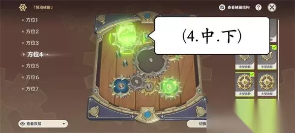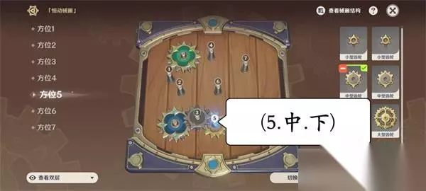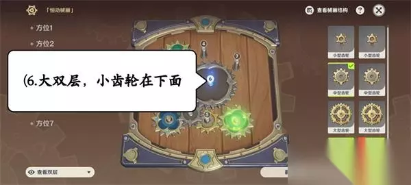 原神复原械画部件之六攻略 1.选择3号位,使用中型双层齿轮,翻转使小齿轮一层在下面。