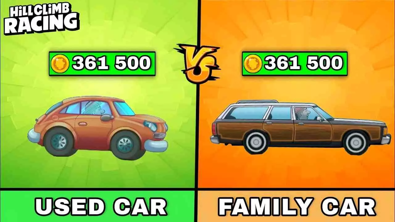 这是《登山赛车》的内容,对游戏里的二手车和家庭车进行对比,二者单辆成本、总成本均为361500,不过家庭车续航时长102s,比二手车的96s更长。