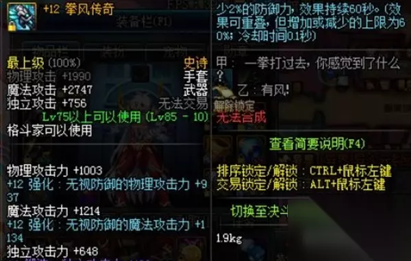 然后就是拳风传奇也是可选的武器之一,这个武器的攻击力是高于永恒守护者,而且还有多种属性的加成。