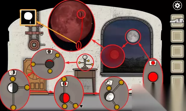 3、查看右边的星象仪,调节三个杆让星象和上方的图案一致,需要完成5次 查看窗户外面的星球,点击星球会流血,点击下方的血滴,血滴会落到天堂岛里变成石头