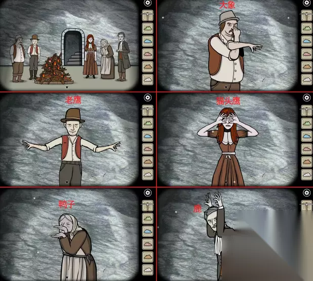14、回到密室入口,这时五个人的动作改变,分别对应大象,鸟,猫头鹰,鸭子,鹿
