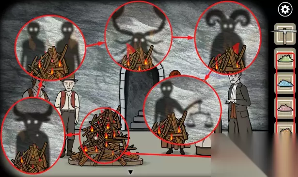 21、窗户外可以看到猫头鹰雕像的位置,左右两侧的火堆控制猫头鹰左右移动,中间的火堆控制猫头鹰雕像前进,通过火堆将猫头鹰雕像移动到木门后
