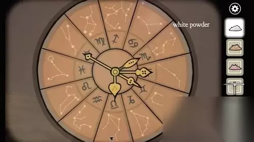 16、到密室一楼,在星座盘上将指针按照天秤座、双鱼座、巨蟹座、射手座、摩羯座的顺序旋转,得到一把钥匙