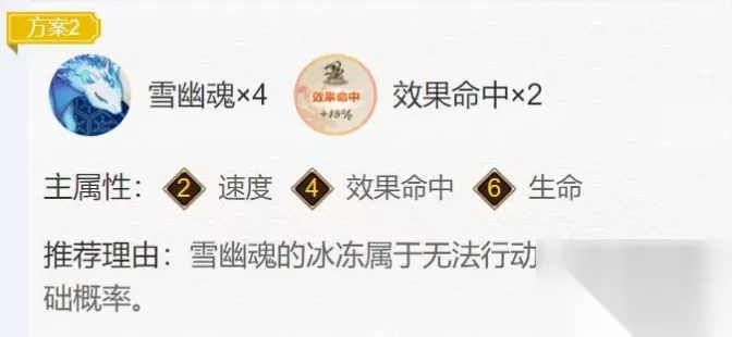方案二:雪幽魂×4,效果命中×2 御魂位置: 2号位:速度 4号位:效果命中 6号位:生命 御魂搭配分析: 有很大概率会冻结目标,多了更多的控制。