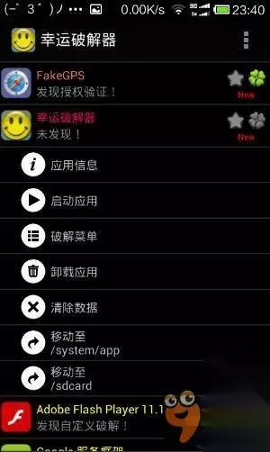 5,再选fake gps(lz的fakegps已经移动了所以没选项,这里用幸运破解器为例)选移动至/system/app(使软件成为系统软件,这样可以不用开模拟定位),重启手机。