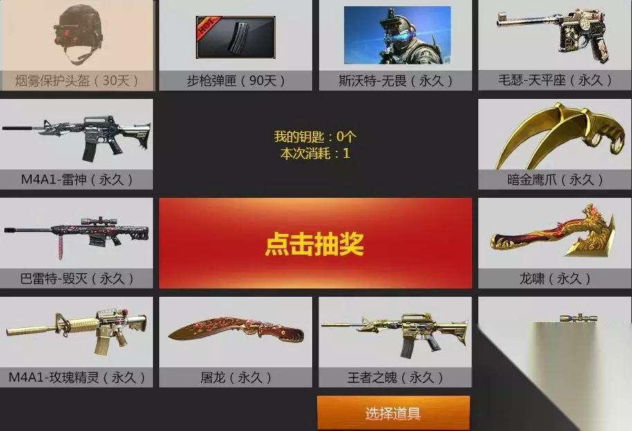 抽奖花费钥匙说明: 第一次是:1个钥匙 第二次是:1个钥匙 第三次是:3个钥匙 第四次是:7个钥匙 第五次是:10个钥匙 第六次是:20个钥匙 第七次是:28个钥匙 第八次是:38个钥匙 第九次是:56个钥匙 第十次是:66个钥匙 第十一次是:88个钥匙 第十二次是:98个钥匙 抽奖前有2次机会更改S级武器,抽奖后不可更改;