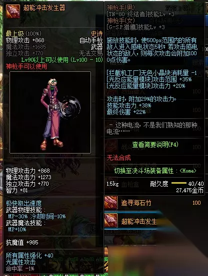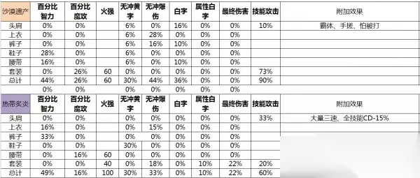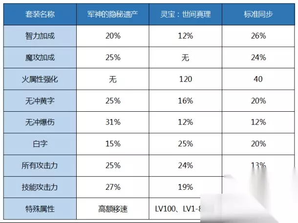除去接近相等的技能攻击,两把武器的最大差异在于: 海石竹是巨额的三攻和力智 超冲击是属强、白字、最终三个词条的加成 即,海石竹搭配三攻和力智较少的装备时表现更为优秀,超冲击搭配白字和最终较少的装备时更为优秀 这里直接给出结论: 在毕业打造下,适合海石竹的套装有:水果3+大幽魂8散搭、皇家执行者、舞姬、铁匠以及大自然,这些套装的具体属性我们后面慢慢介绍,首饰适合大恍惚 适合超冲击的套装有:大魔法师、大祭司、沙漠遗产、擎天战甲、选择歧路、永恒、荆棘、以及各式选择歧路2+3散搭套装,首饰更倾向于幸运三角 2、首饰部位 一句话结论:幸运三角和破晓时分均为毕业级首饰套装,黎明时分胜在23%的CD,幸运三角胜在更高的极限爆发 暂时把散搭放在一边,三件套装的首饰,CD较弱,基本上是黎明时分和幸运三角在争锋,这里我们直接给出结论数据,一般我们认为: 13黎明时分对比幸运三角,相当于用4%的伤害,换取23%的减CD,全部首饰每少一增幅等级,伤害下降约1.9%,红10破晓时分比幸运三角低10%左右的伤害,可自行取舍(数值会受到其他搭配的影响) 3、特殊三件套 一句话结论:毕业无脑选择军神套,灵宝和标准同步器强度相仿,过渡也可 除非移速低于60%,不然军神套都是最优选择,在实战环境下,机械几乎不可能低于60%移速,以下为特殊三件套装备属性表